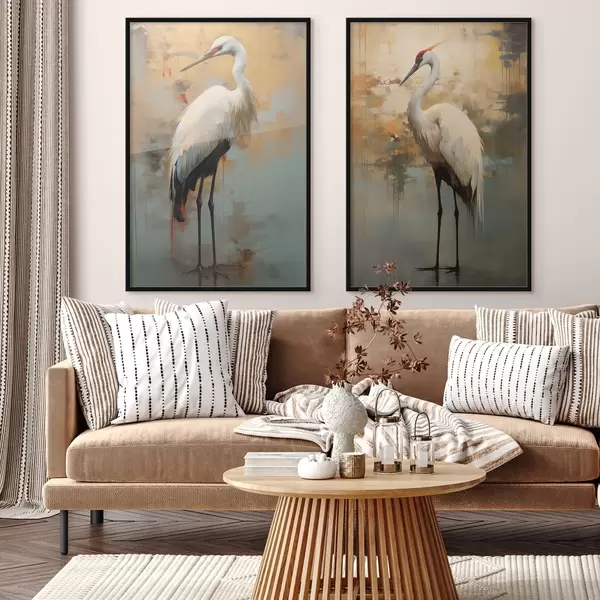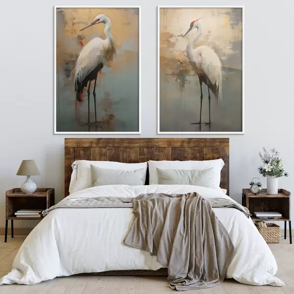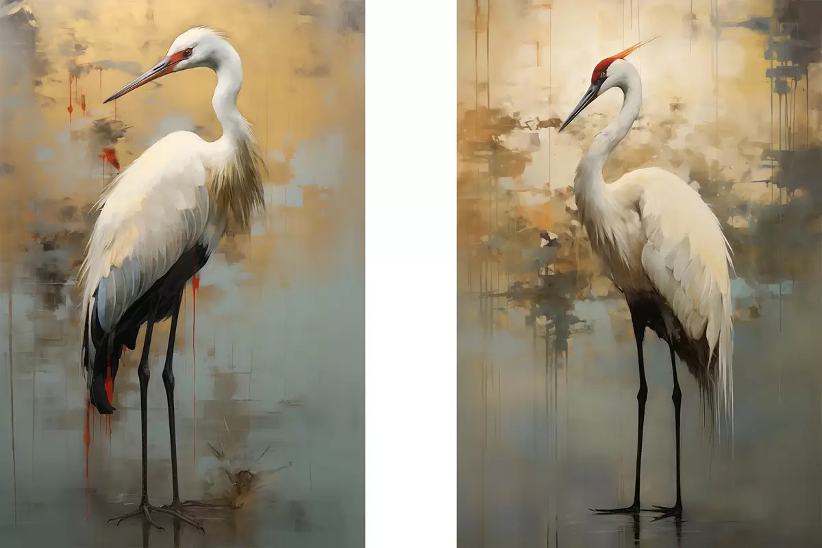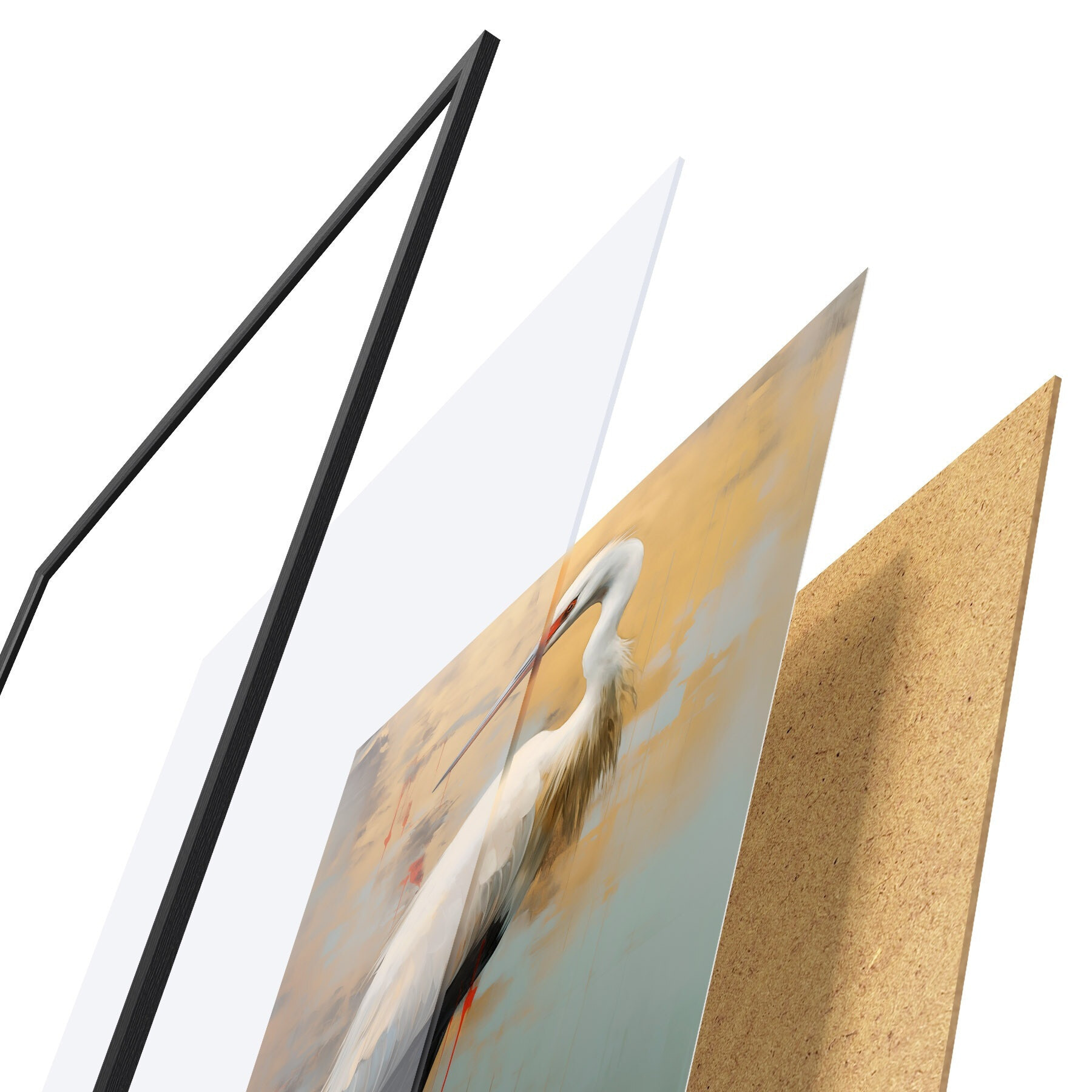 Poster Bílá volavka na pozadí tlumených žlutých, hnědých a modrých odstínů naznačujících mlhavou abstraktní krajinu Č. d00530