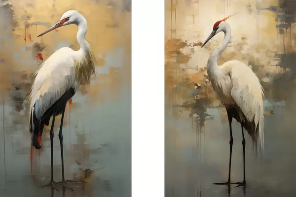 Poster Bílá volavka na pozadí tlumených žlutých, hnědých a modrých odstínů naznačujících mlhavou abstraktní krajinu Č. d00530