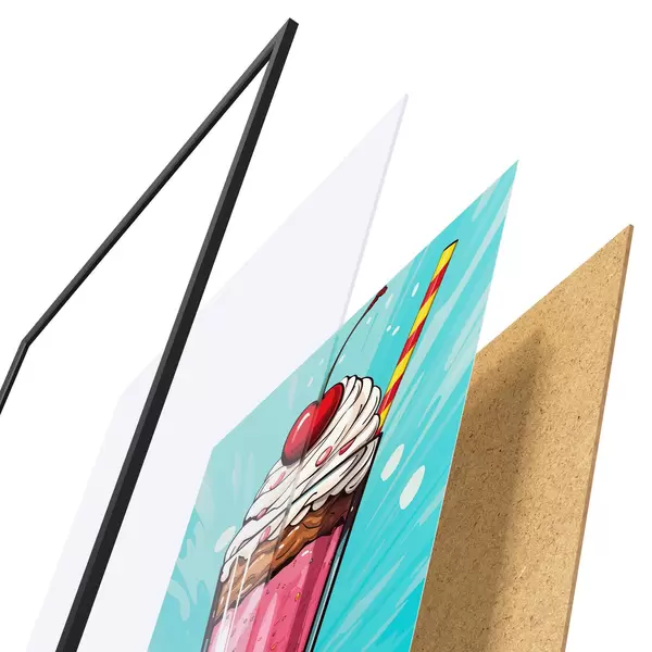 Plakát se skládá z rámu, plexiskla, tištěného obrazu a dřevotřískového podkladu. Díky úchytům na zadní straně lze plakát ihned zavěsit na zeď.