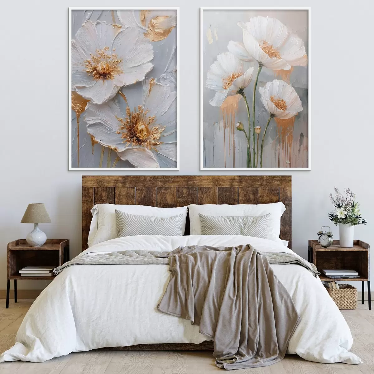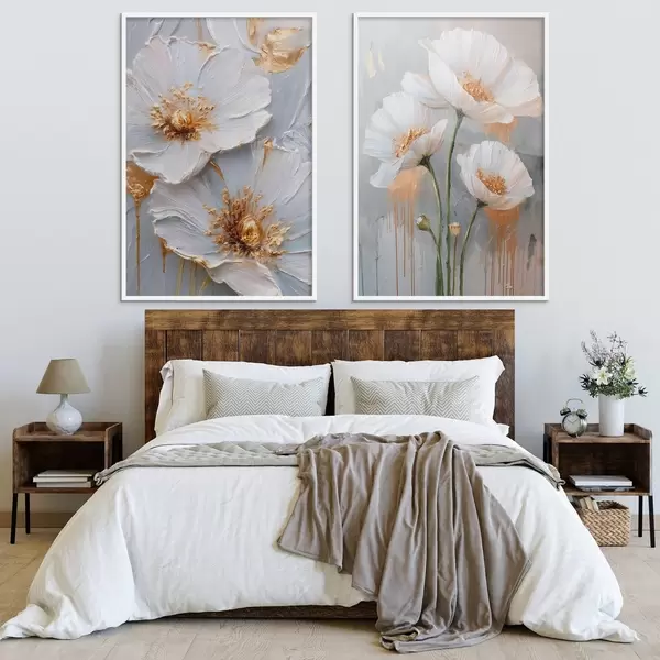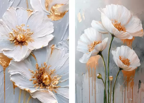 Poster Objemová malba bílých květů se zlatými akcenty na šedém pozadí Č. d00568