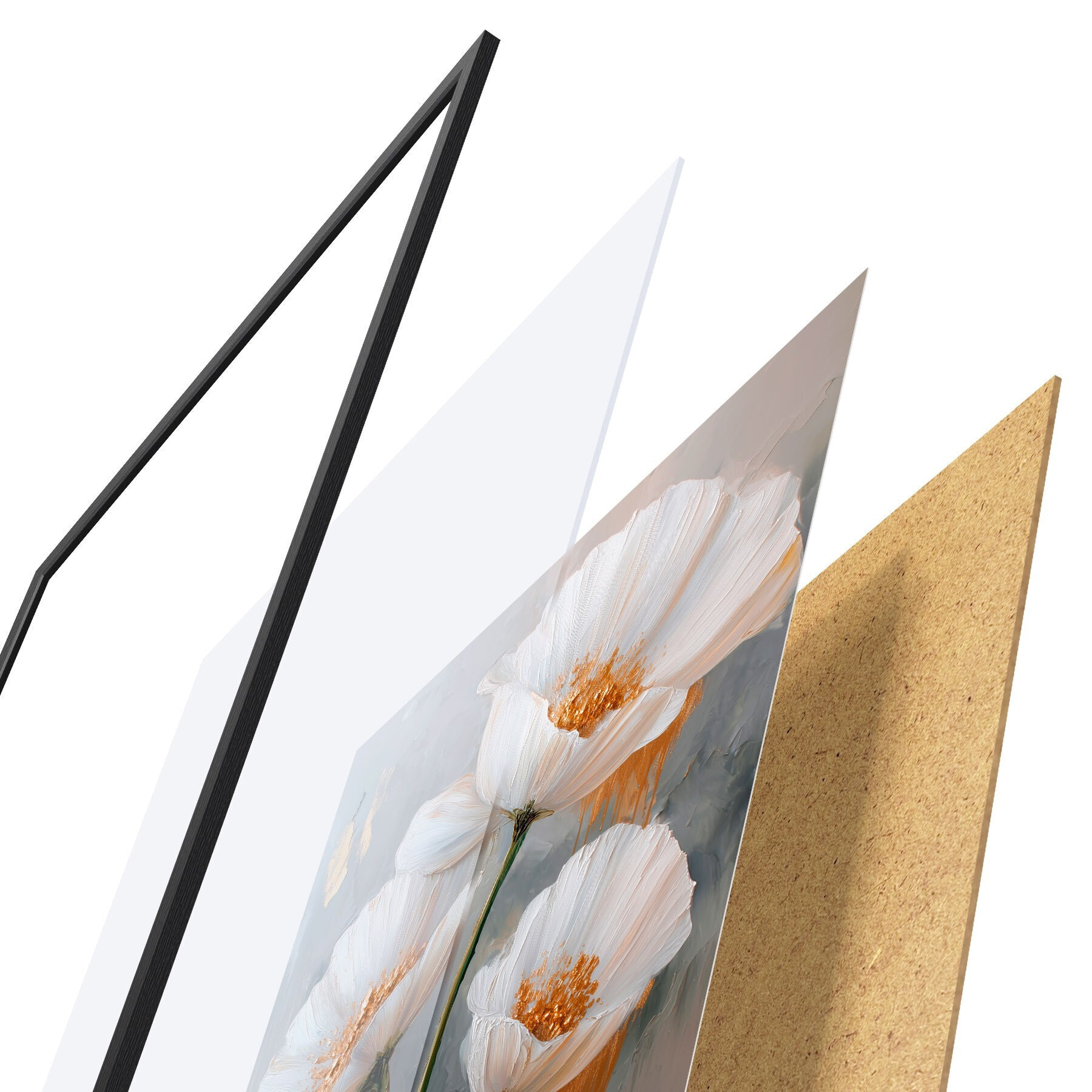 Plakát se skládá z rámu, plexiskla, tištěného obrazu a dřevotřískového podkladu. Díky úchytům na zadní straně lze plakát ihned zavěsit na zeď.