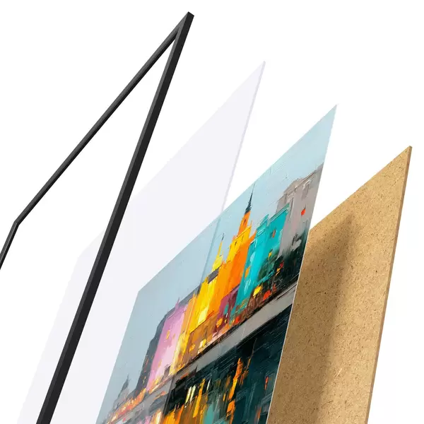 Plakát se skládá z rámu, plexiskla, tištěného obrazu a dřevotřískového podkladu. Díky úchytům na zadní straně lze plakát ihned zavěsit na zeď.