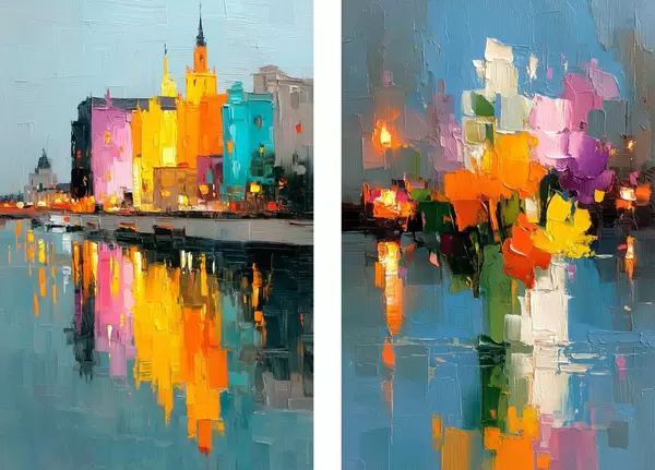 Poster Dynamika města: abstraktní kompozice s odrazy světel na řece Č. d00569