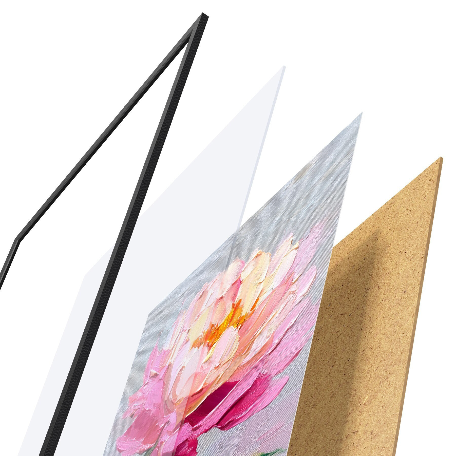 Plakát se skládá z rámu, plexiskla, tištěného obrazu a dřevotřískového podkladu. Díky úchytům na zadní straně lze plakát ihned zavěsit na zeď.