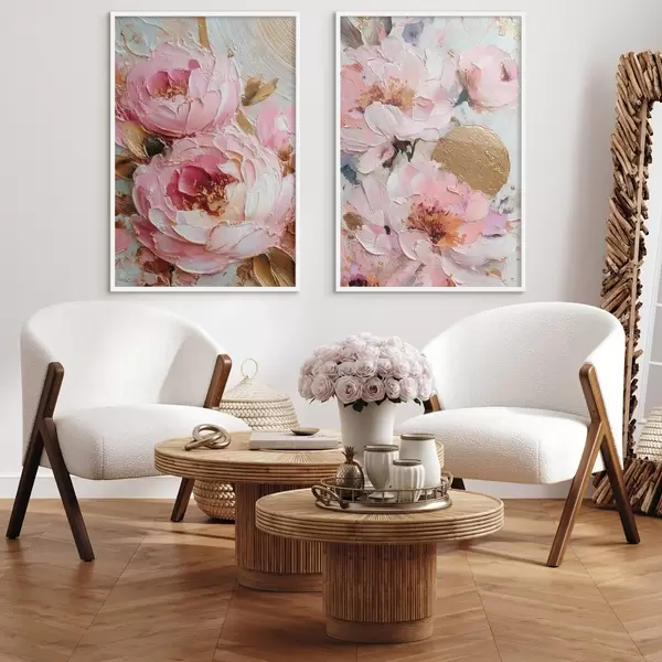 Poster Volumetrická malba impastem s růžovými pivoňkami a texturovanými detaily Č. d00573