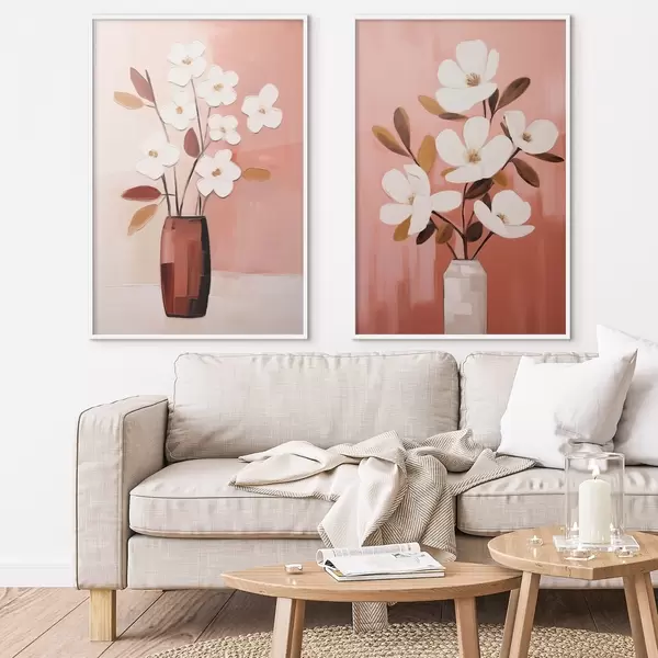Poster Kompozice s kontrastními vázami a strukturovanými bílými květy Č. d00575