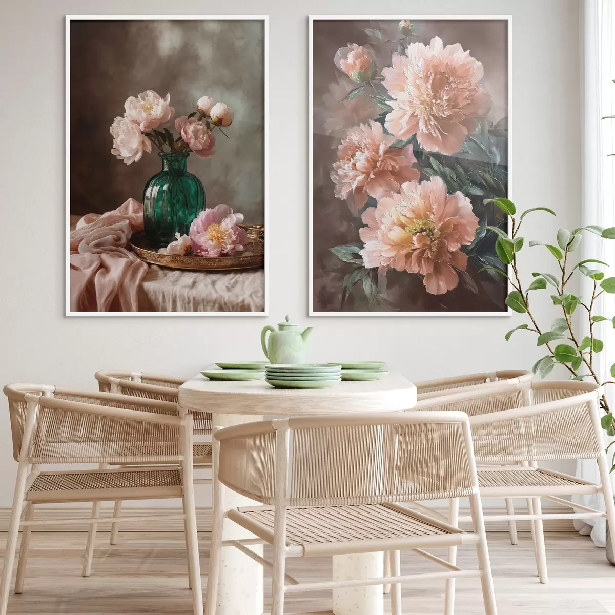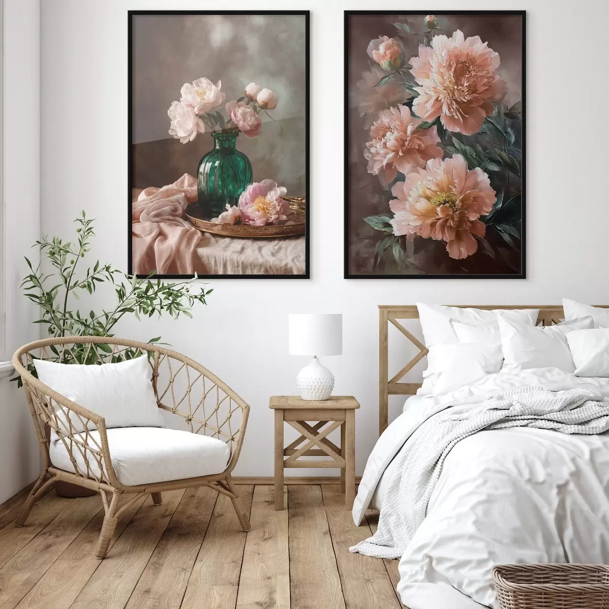 Poster Párová kompozice s růžovými pivoňkami ve váze a na plátně Č. d00578