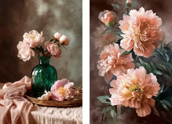Poster Párová kompozice s růžovými pivoňkami ve váze a na plátně Č. d00578