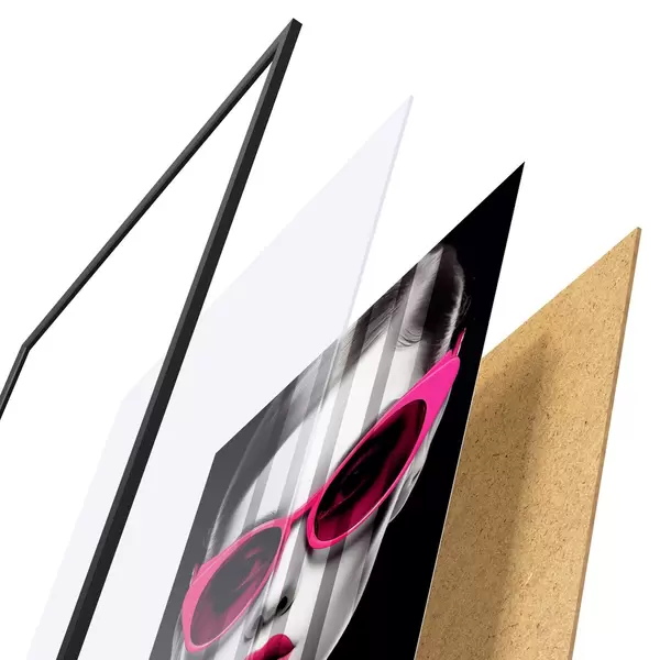 Plakát se skládá z rámu, plexiskla, tištěného obrazu a dřevotřískového podkladu. Díky úchytům na zadní straně lze plakát ihned zavěsit na zeď.
