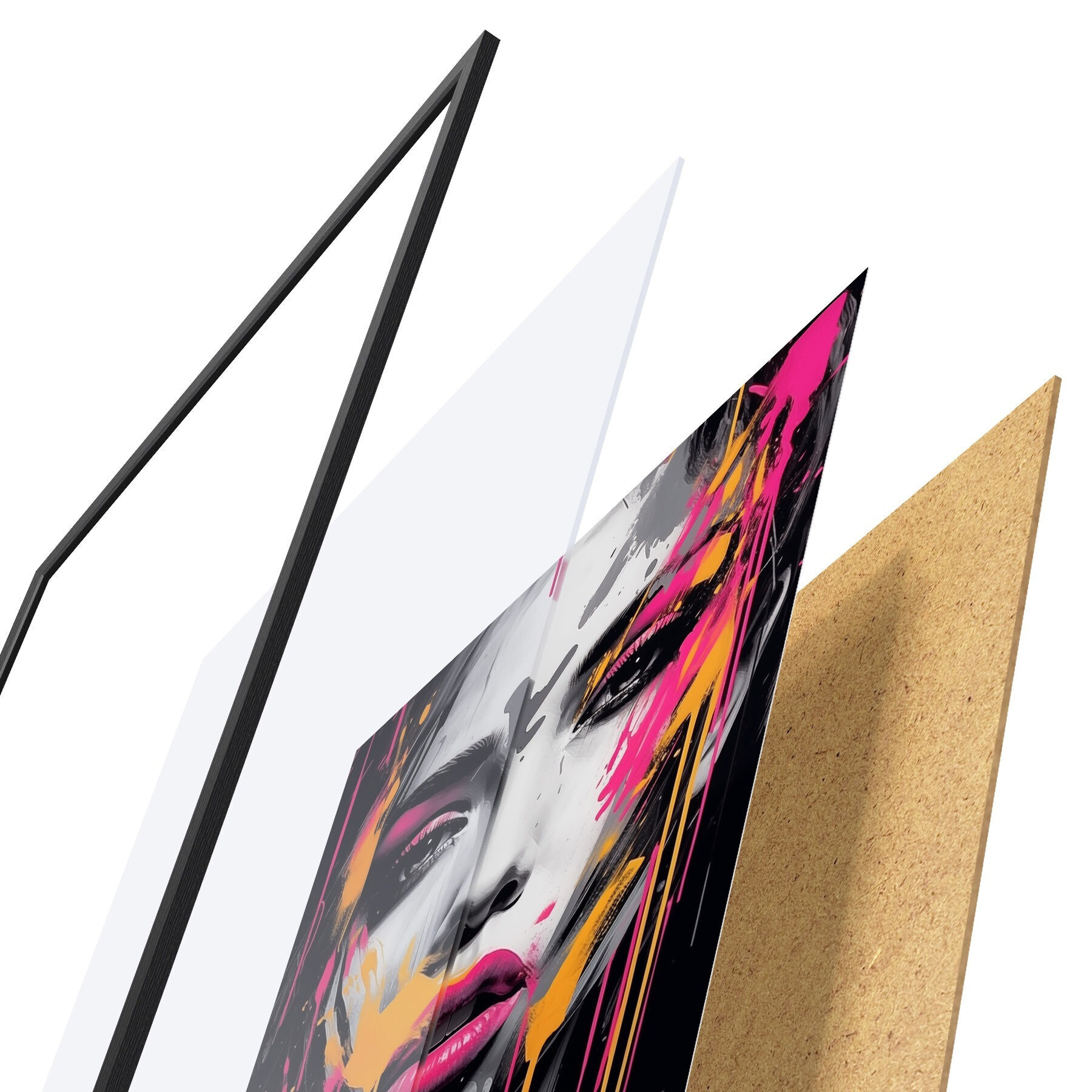 Plakát se skládá z rámu, plexiskla, tištěného obrazu a dřevotřískového podkladu. Díky úchytům na zadní straně lze plakát ihned zavěsit na zeď.