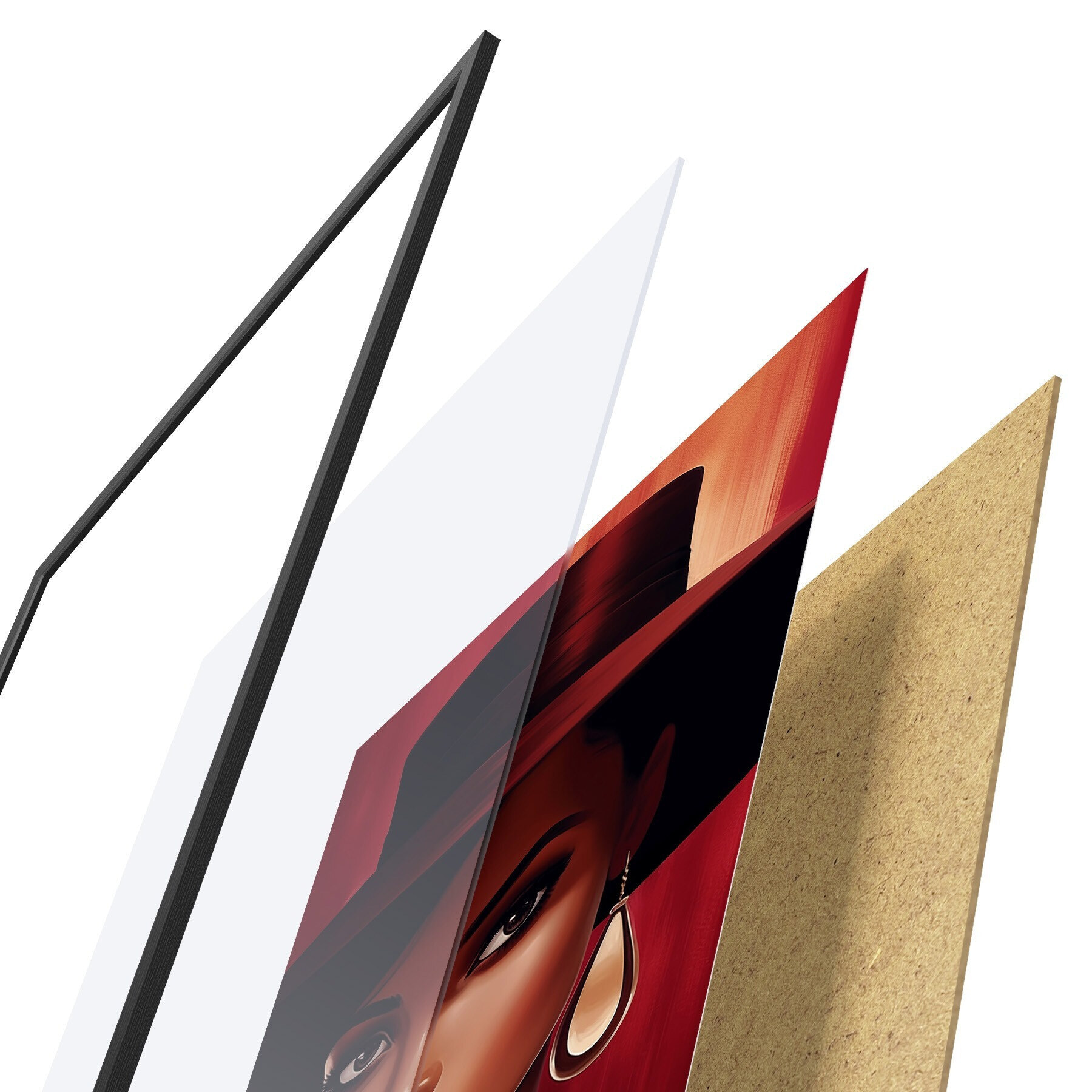Plakát se skládá z rámu, plexiskla, tištěného obrazu a dřevotřískového podkladu. Díky úchytům na zadní straně lze plakát ihned zavěsit na zeď.