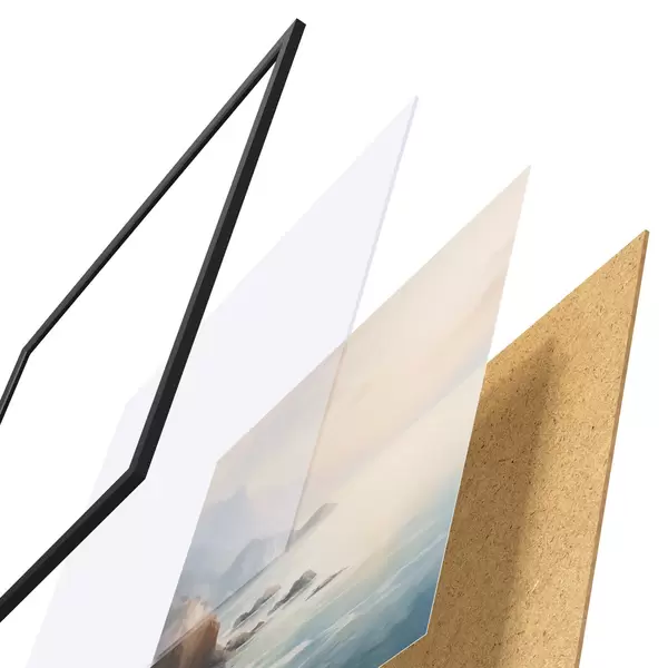 Plakát se skládá z rámu, plexiskla, tištěného obrazu a dřevotřískového podkladu. Díky úchytům na zadní straně lze plakát ihned zavěsit na zeď.