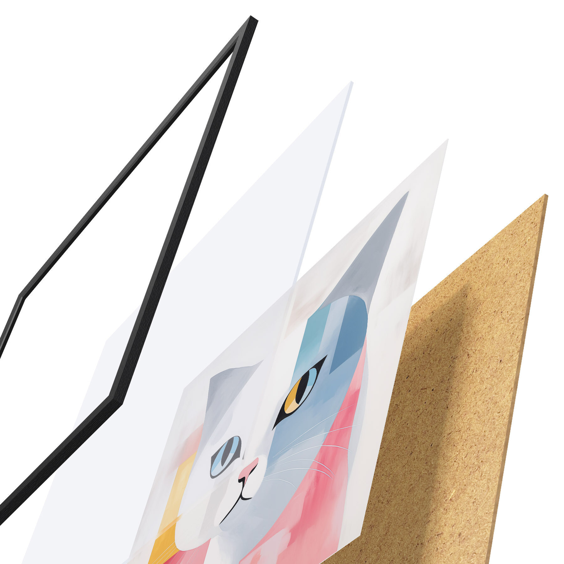 Plakát se skládá z rámu, plexiskla, tištěného obrazu a dřevotřískového podkladu. Díky úchytům na zadní straně lze plakát ihned zavěsit na zeď.