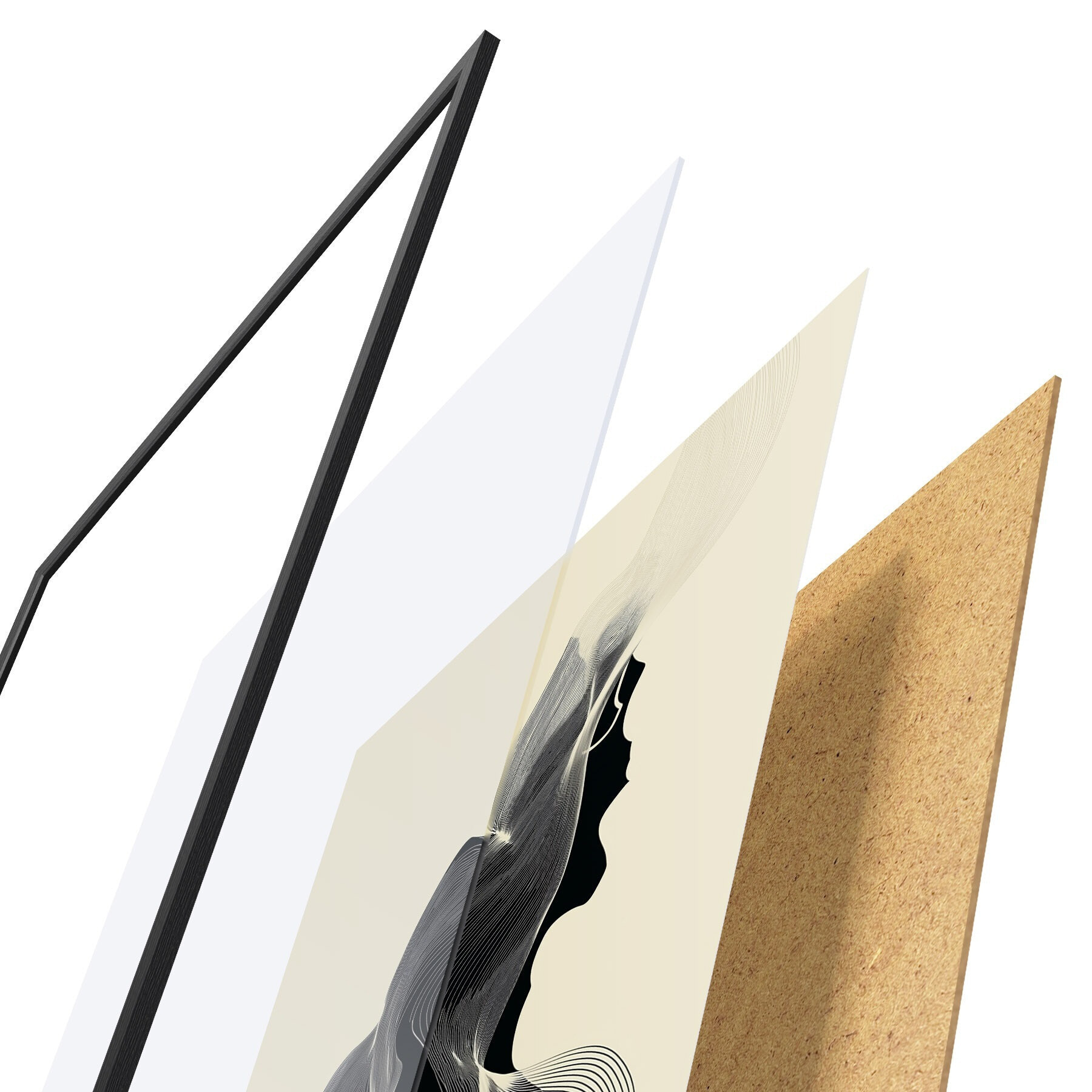 Plakát se skládá z rámu, plexiskla, tištěného obrazu a dřevotřískového podkladu. Díky úchytům na zadní straně lze plakát ihned zavěsit na zeď.