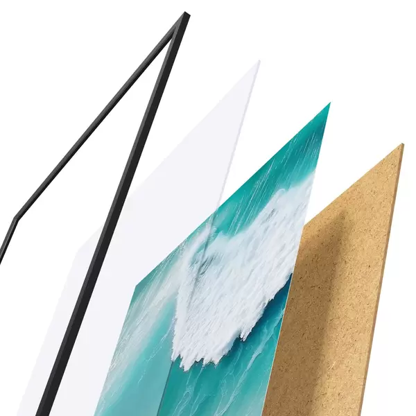Plakát se skládá z rámu, plexiskla, tištěného obrazu a dřevotřískového podkladu. Díky úchytům na zadní straně lze plakát ihned zavěsit na zeď.