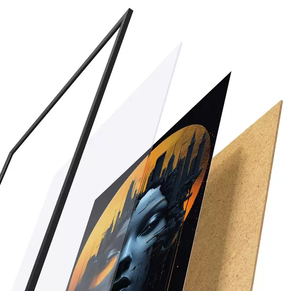 Plakát se skládá z rámu, plexiskla, tištěného obrazu a dřevotřískového podkladu. Díky úchytům na zadní straně lze plakát ihned zavěsit na zeď.