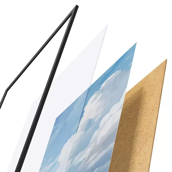 Plakát se skládá z rámu, plexiskla, tištěného obrazu a dřevotřískového podkladu. Díky úchytům na zadní straně lze plakát ihned zavěsit na zeď.