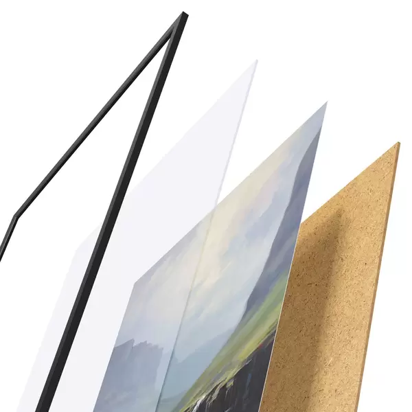 Plakát se skládá z rámu, plexiskla, tištěného obrazu a dřevotřískového podkladu. Díky úchytům na zadní straně lze plakát ihned zavěsit na zeď.