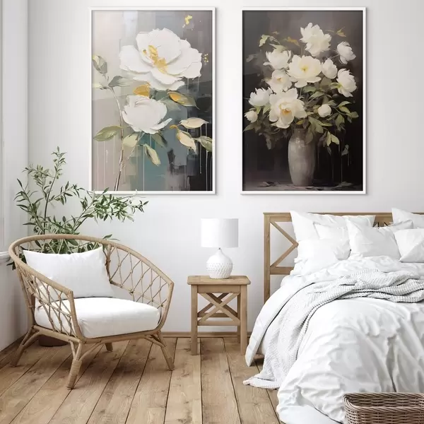 Poster Bílé pivoňky na tmavém pozadí: dekorativní kompozice Č. d00634