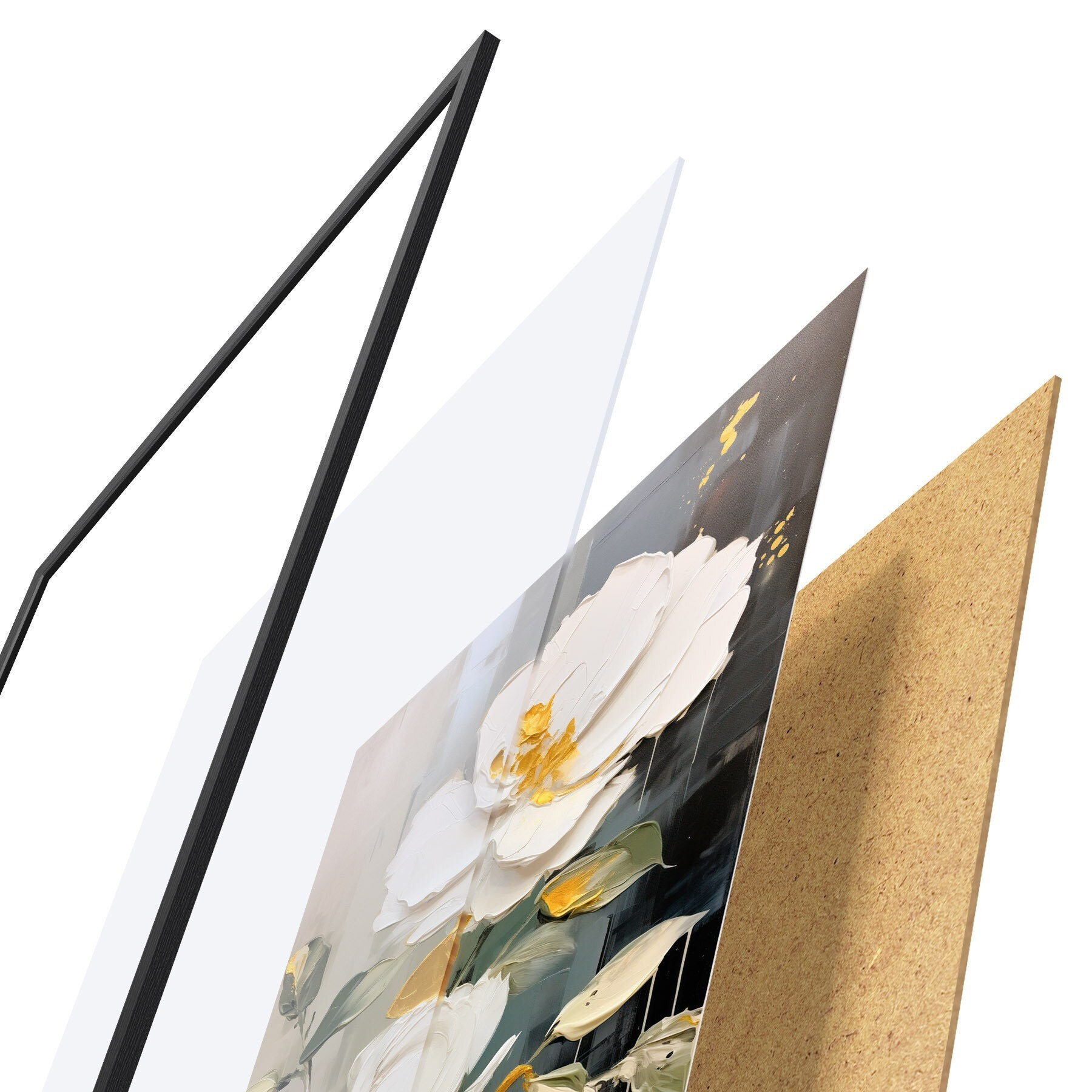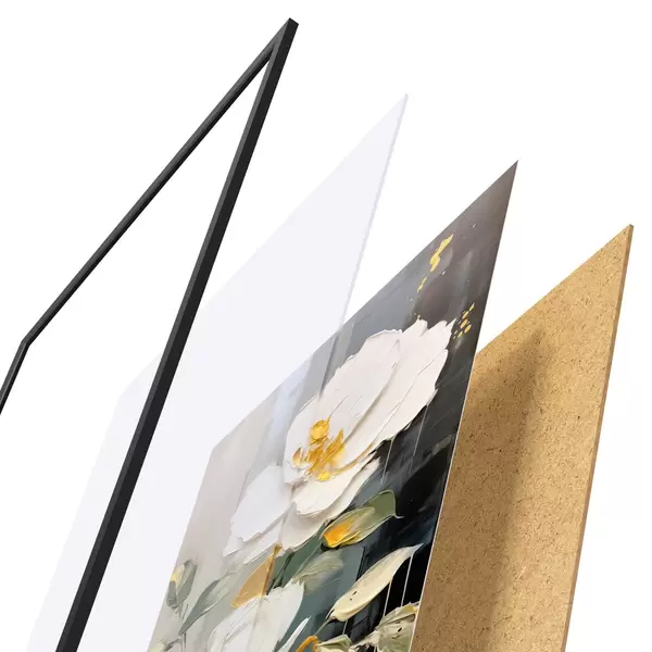 Plakát se skládá z rámu, plexiskla, tištěného obrazu a dřevotřískového podkladu. Díky úchytům na zadní straně lze plakát ihned zavěsit na zeď.