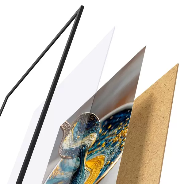 Plakát se skládá z rámu, plexiskla, tištěného obrazu a dřevotřískového podkladu. Díky úchytům na zadní straně lze plakát ihned zavěsit na zeď.