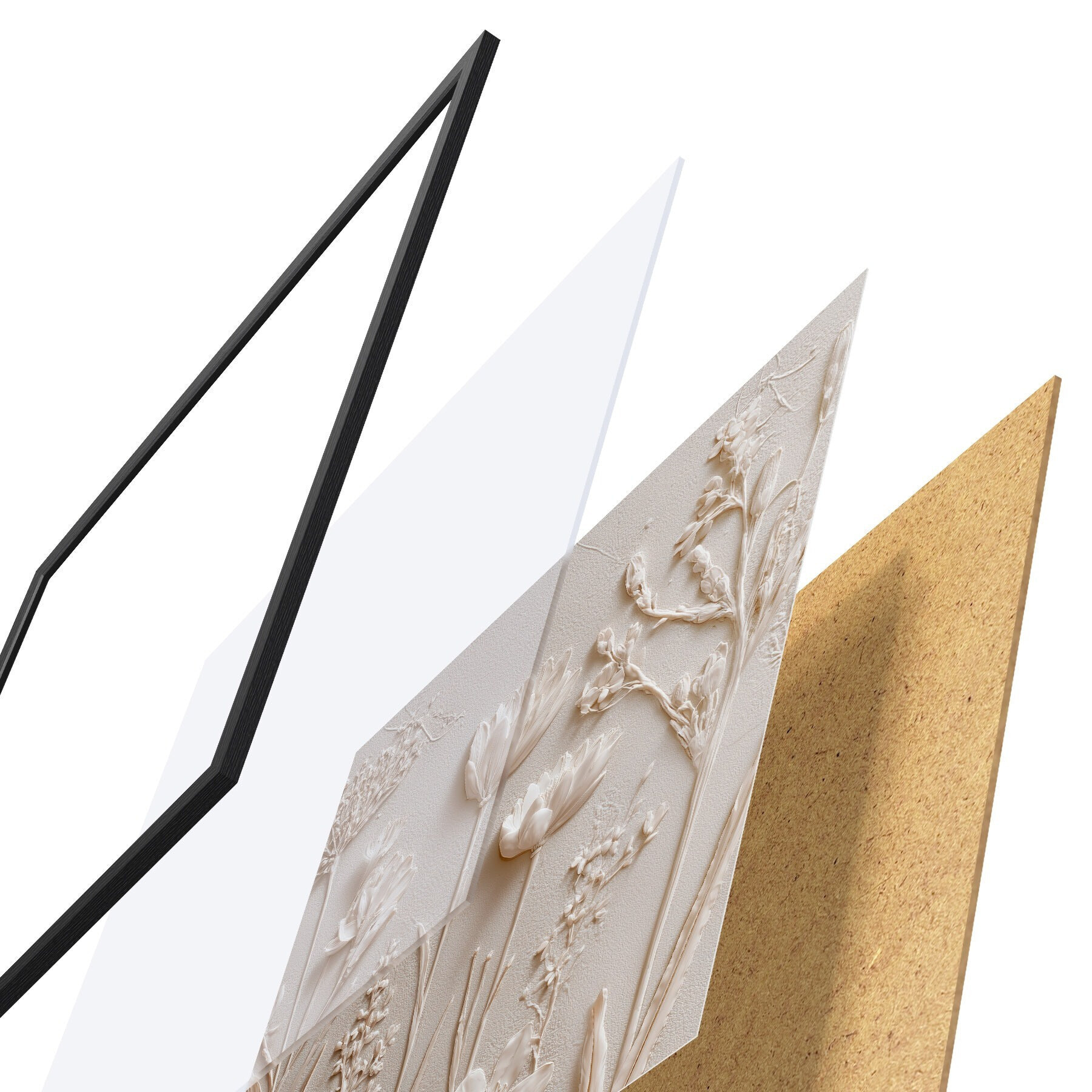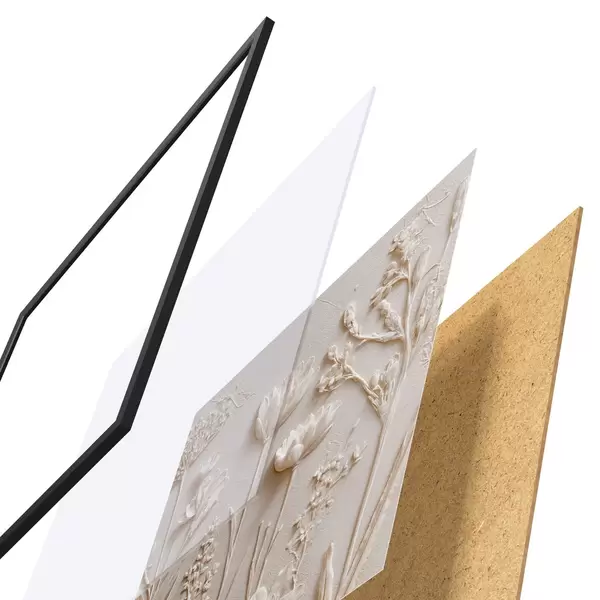 Plakát se skládá z rámu, plexiskla, tištěného obrazu a dřevotřískového podkladu. Díky úchytům na zadní straně lze plakát ihned zavěsit na zeď.