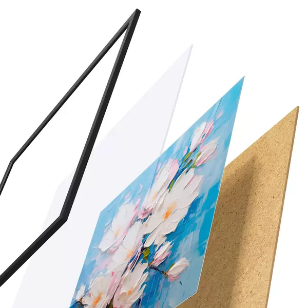 Plakát se skládá z rámu, plexiskla, tištěného obrazu a dřevotřískového podkladu. Díky úchytům na zadní straně lze plakát ihned zavěsit na zeď.