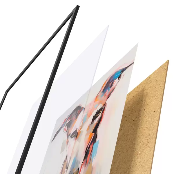 Plakát se skládá z rámu, plexiskla, tištěného obrazu a dřevotřískového podkladu. Díky úchytům na zadní straně lze plakát ihned zavěsit na zeď.