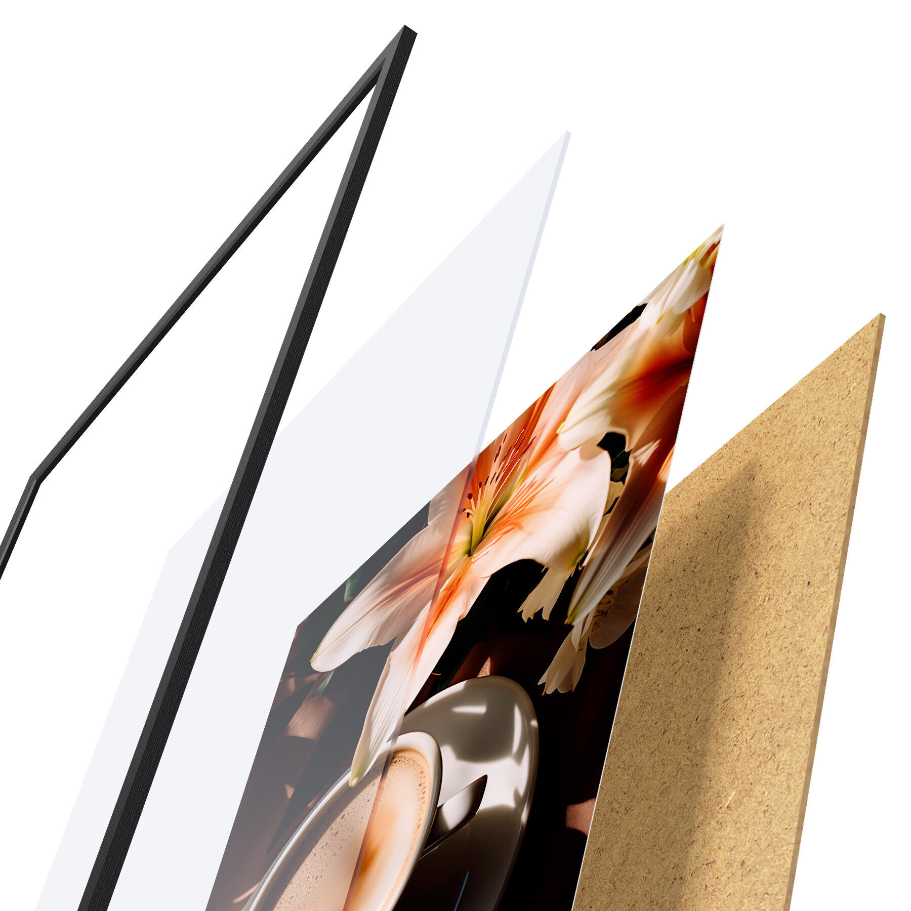 Plakát se skládá z rámu, plexiskla, tištěného obrazu a dřevotřískového podkladu. Díky úchytům na zadní straně lze plakát ihned zavěsit na zeď.