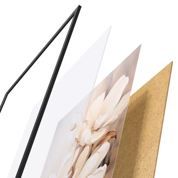 Plakát se skládá z rámu, plexiskla, tištěného obrazu a dřevotřískového podkladu. Díky úchytům na zadní straně lze plakát ihned zavěsit na zeď.
