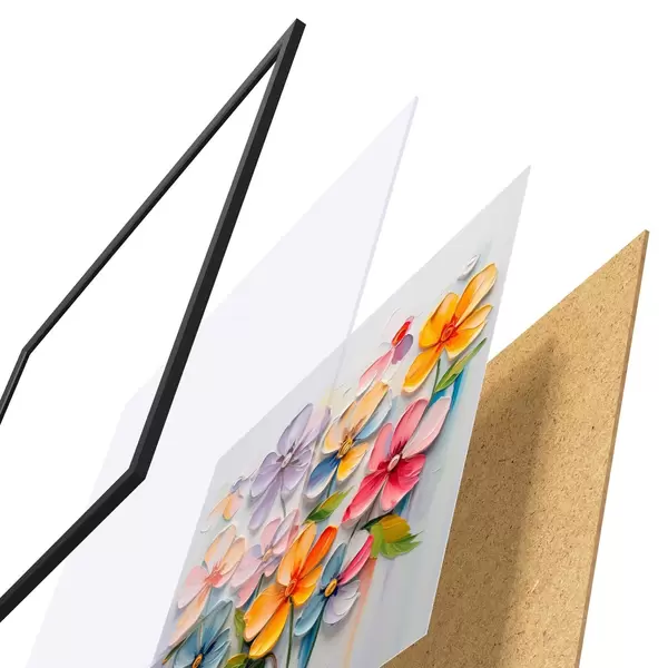Plakát se skládá z rámu, plexiskla, tištěného obrazu a dřevotřískového podkladu. Díky úchytům na zadní straně lze plakát ihned zavěsit na zeď.