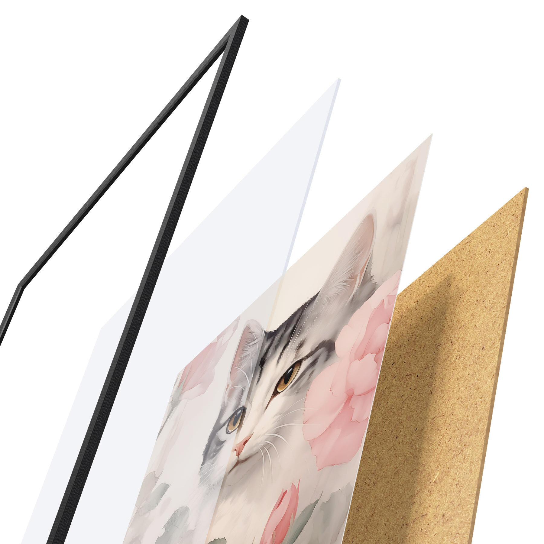 Plakát se skládá z rámu, plexiskla, tištěného obrazu a dřevotřískového podkladu. Díky úchytům na zadní straně lze plakát ihned zavěsit na zeď.