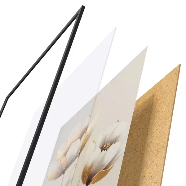 Plakát se skládá z rámu, plexiskla, tištěného obrazu a dřevotřískového podkladu. Díky úchytům na zadní straně lze plakát ihned zavěsit na zeď.