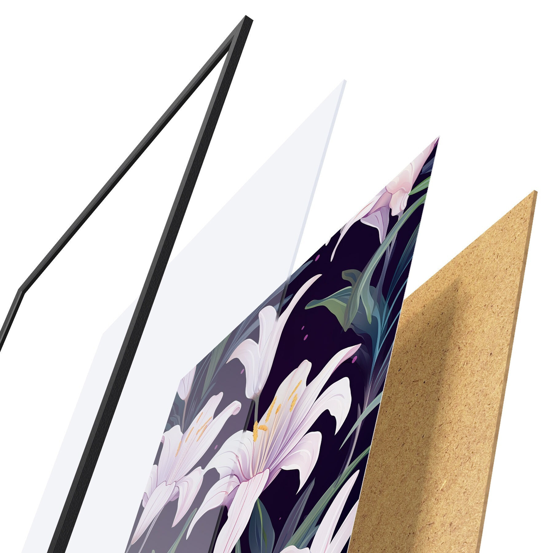 Plakát se skládá z rámu, plexiskla, tištěného obrazu a dřevotřískového podkladu. Díky úchytům na zadní straně lze plakát ihned zavěsit na zeď.