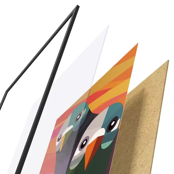 Plakát se skládá z rámu, plexiskla, tištěného obrazu a dřevotřískového podkladu. Díky úchytům na zadní straně lze plakát ihned zavěsit na zeď.