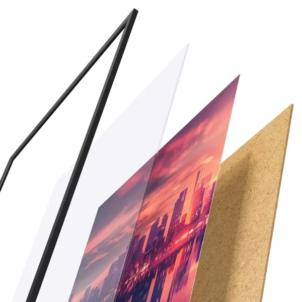 Plakát se skládá z rámu, plexiskla, tištěného obrazu a dřevotřískového podkladu. Díky úchytům na zadní straně lze plakát ihned zavěsit na zeď.