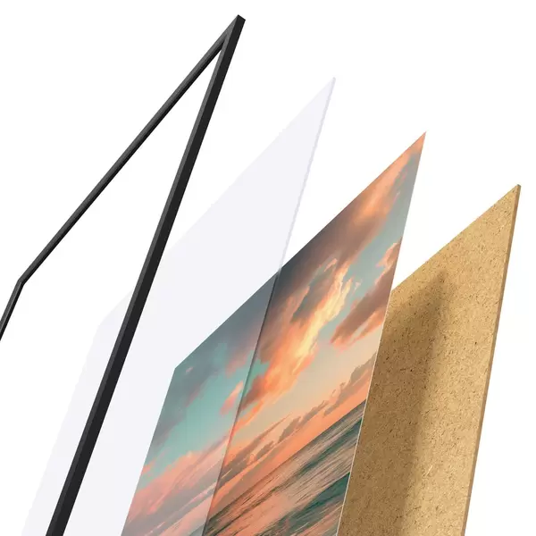 Plakát se skládá z rámu, plexiskla, tištěného obrazu a dřevotřískového podkladu. Díky úchytům na zadní straně lze plakát ihned zavěsit na zeď.