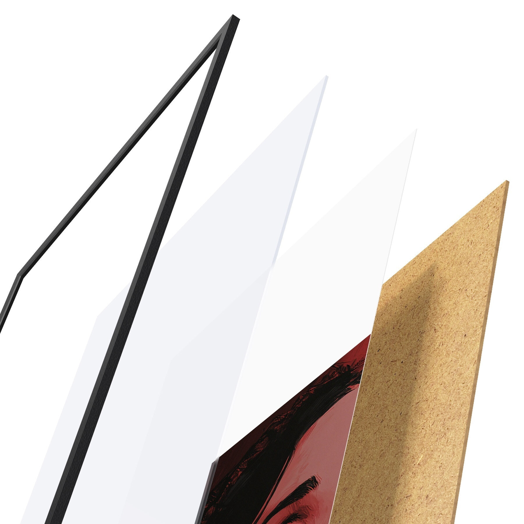 Plakát se skládá z rámu, plexiskla, tištěného obrazu a dřevotřískového podkladu. Díky úchytům na zadní straně lze plakát ihned zavěsit na zeď.
