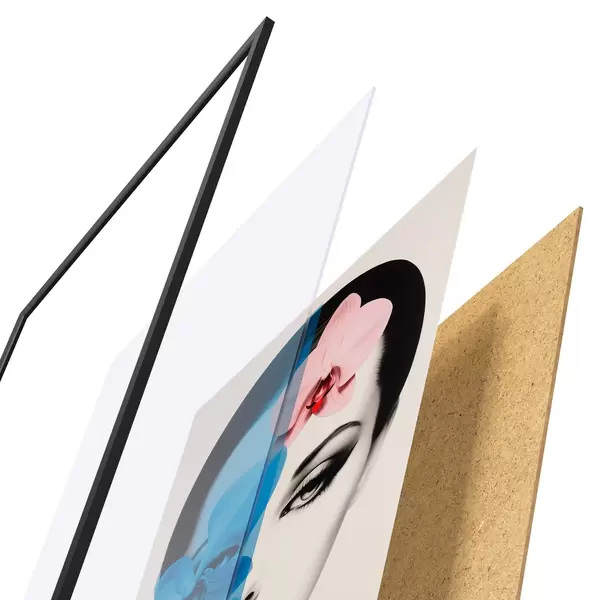 Plakát se skládá z rámu, plexiskla, tištěného obrazu a dřevotřískového podkladu. Díky úchytům na zadní straně lze plakát ihned zavěsit na zeď.
