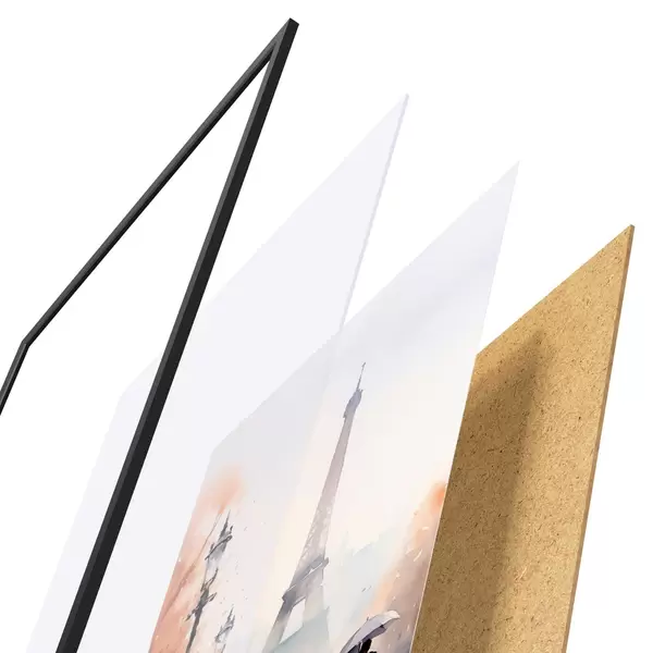 Plakát se skládá z rámu, plexiskla, tištěného obrazu a dřevotřískového podkladu. Díky úchytům na zadní straně lze plakát ihned zavěsit na zeď.
