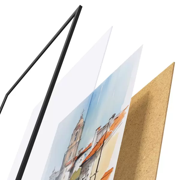 Plakát se skládá z rámu, plexiskla, tištěného obrazu a dřevotřískového podkladu. Díky úchytům na zadní straně lze plakát ihned zavěsit na zeď.