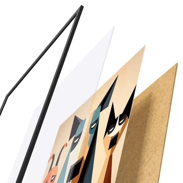Plakát se skládá z rámu, plexiskla, tištěného obrazu a dřevotřískového podkladu. Díky úchytům na zadní straně lze plakát ihned zavěsit na zeď.