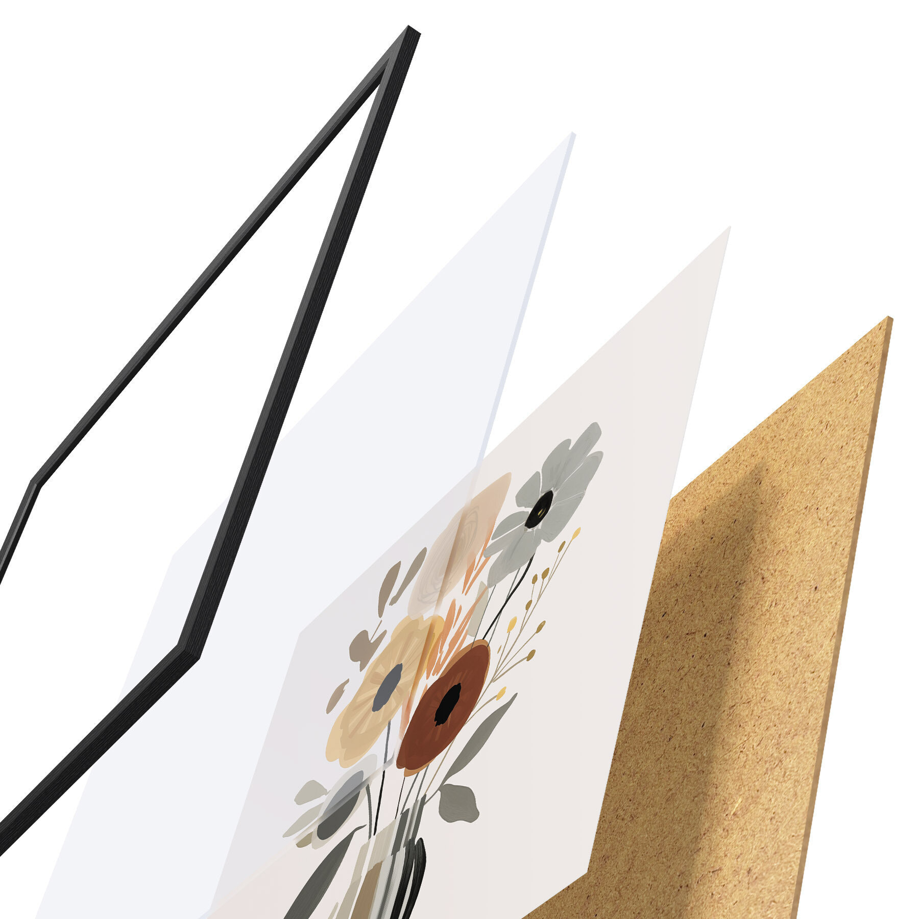 Plakát se skládá z rámu, plexiskla, tištěného obrazu a dřevotřískového podkladu. Díky úchytům na zadní straně lze plakát ihned zavěsit na zeď.