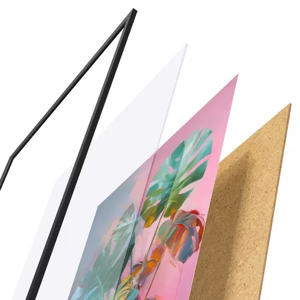 Plakát se skládá z rámu, plexiskla, tištěného obrazu a dřevotřískového podkladu. Díky úchytům na zadní straně lze plakát ihned zavěsit na zeď.