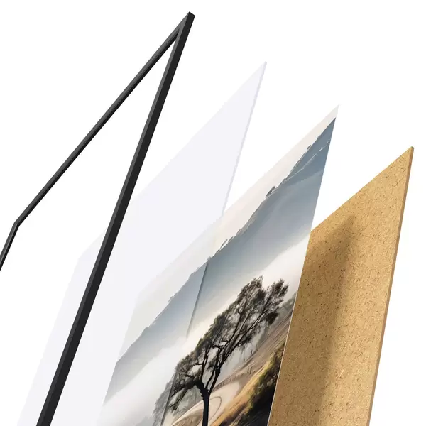 Plakát se skládá z rámu, plexiskla, tištěného obrazu a dřevotřískového podkladu. Díky úchytům na zadní straně lze plakát ihned zavěsit na zeď.