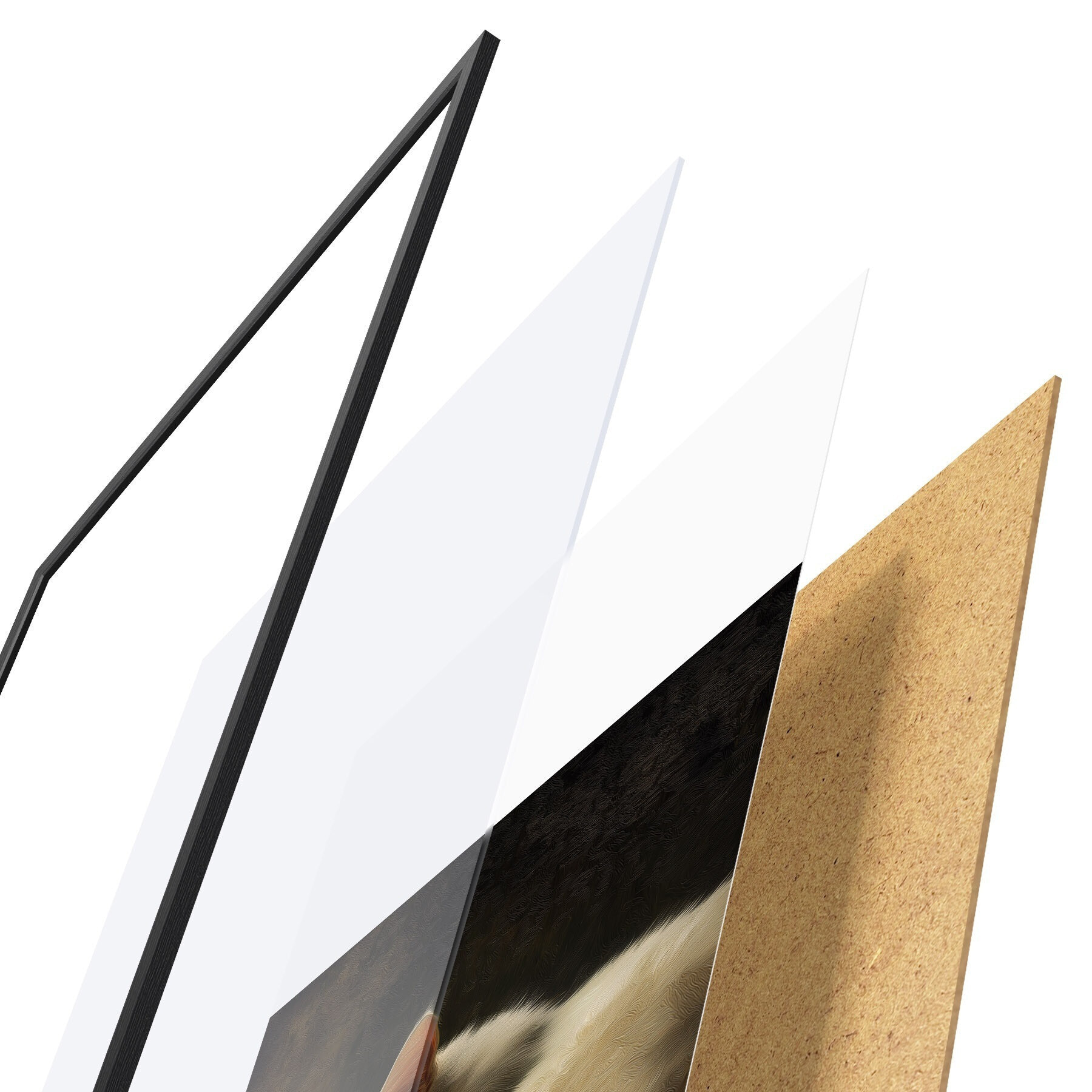 Plakát se skládá z rámu, plexiskla, tištěného obrazu a dřevotřískového podkladu. Díky úchytům na zadní straně lze plakát ihned zavěsit na zeď.