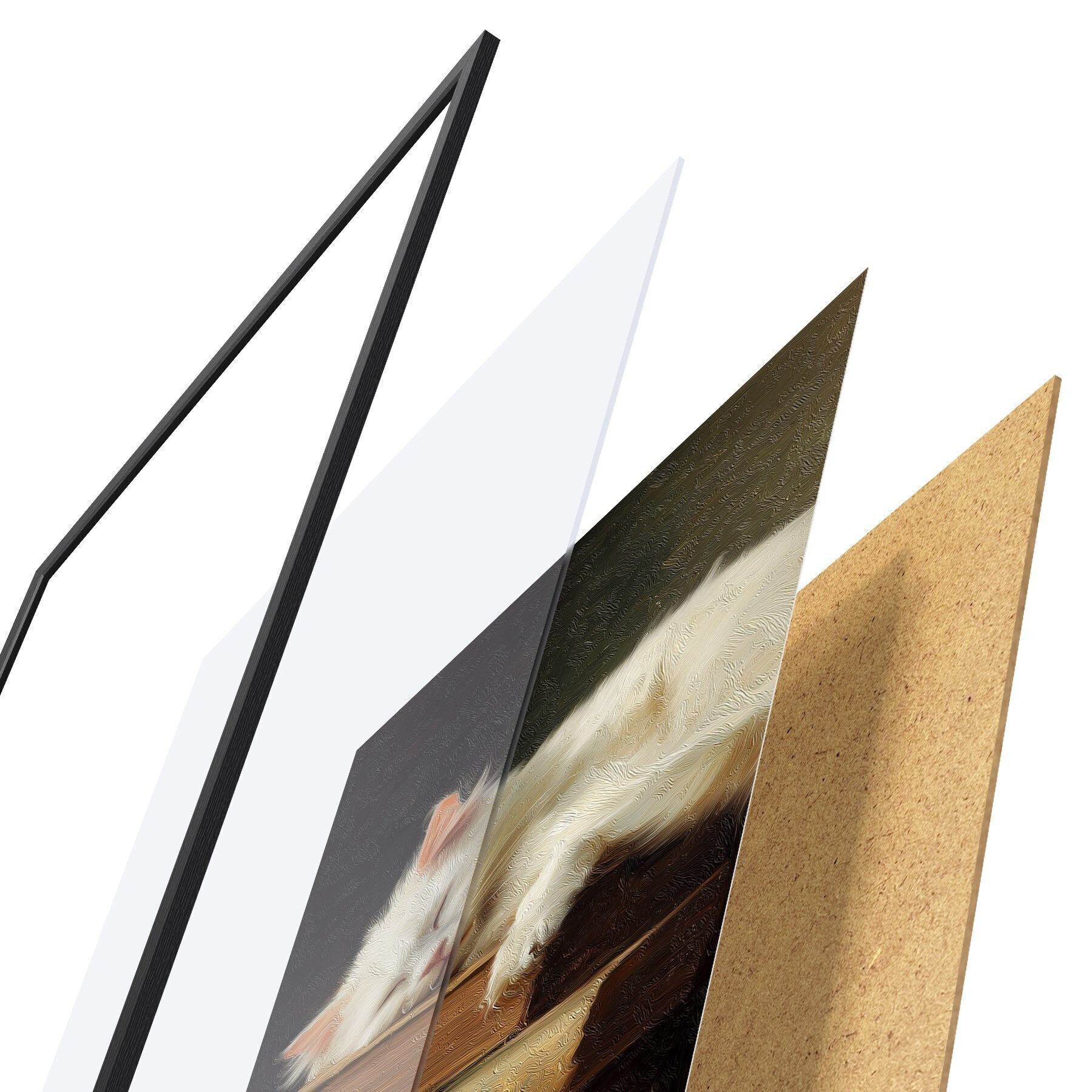 Plakát se skládá z rámu, plexiskla, tištěného obrazu a dřevotřískového podkladu. Díky úchytům na zadní straně lze plakát ihned zavěsit na zeď.