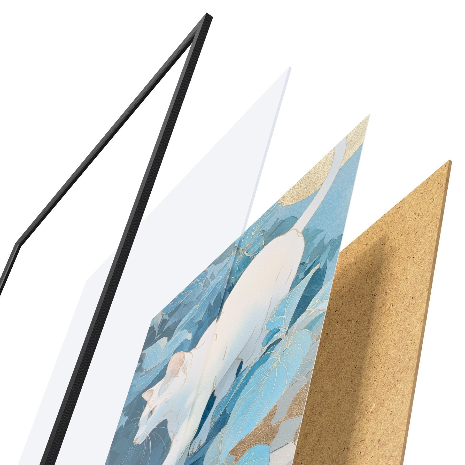 Plakát se skládá z rámu, plexiskla, tištěného obrazu a dřevotřískového podkladu. Díky úchytům na zadní straně lze plakát ihned zavěsit na zeď.