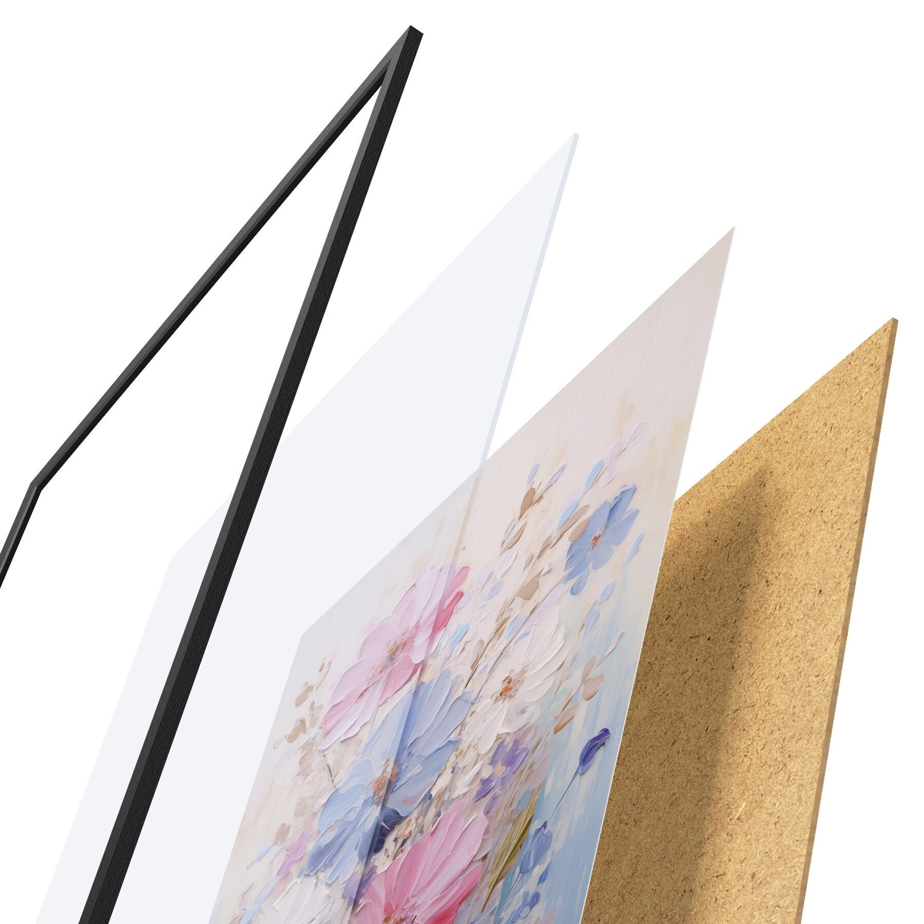 Plakát se skládá z rámu, plexiskla, tištěného obrazu a dřevotřískového podkladu. Díky úchytům na zadní straně lze plakát ihned zavěsit na zeď.