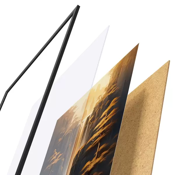 Plakát se skládá z rámu, plexiskla, tištěného obrazu a dřevotřískového podkladu. Díky úchytům na zadní straně lze plakát ihned zavěsit na zeď.